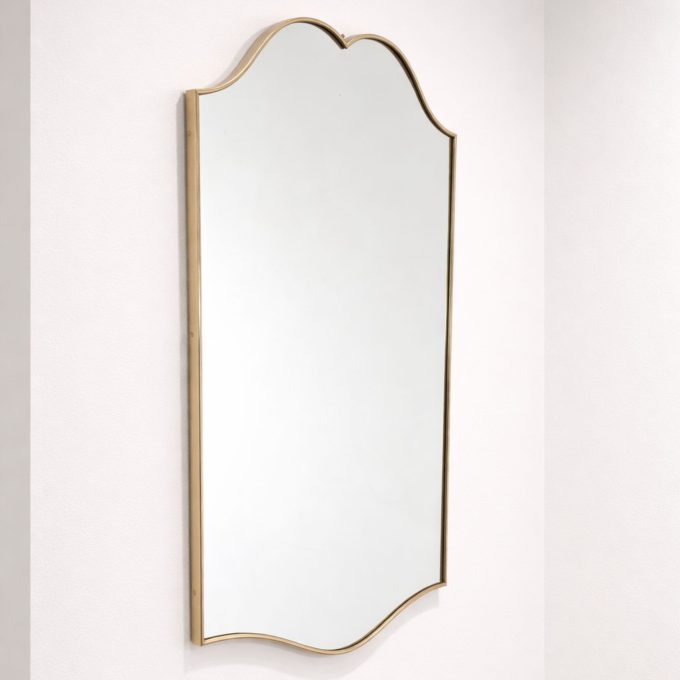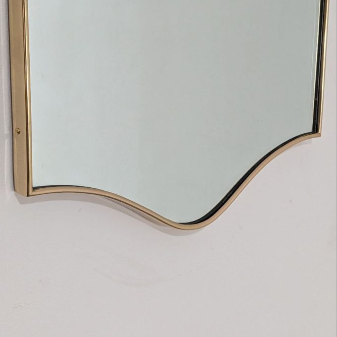The design features a sleek, sinuous silhouette, with soft lines and balanced proportions that recall the refined aesthetic of post-war Italian design. The brass frame precisely follows the mirror’s wavy profile, creating a decorative element that is light yet visually striking.