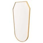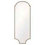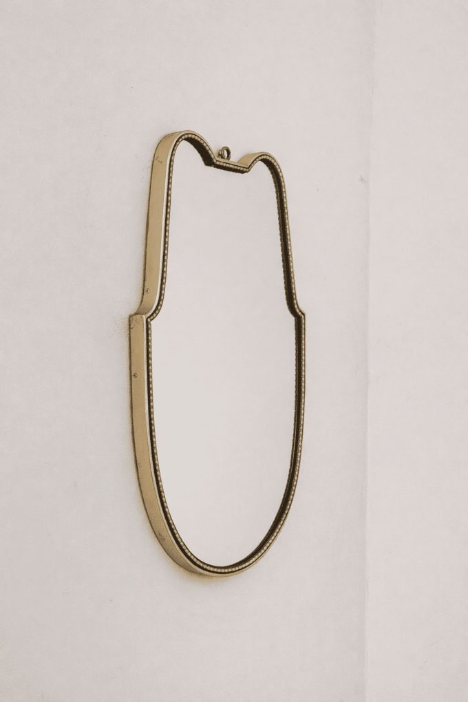 The slender and well-proportioned silhouette is defined by a thin brass frame that delicately follows the perimeter of the mirror. The contoured top and the soft curve of the base create a minimalist yet distinctive decorative presence, capable of fitting effortlessly into sophisticated and bright interiors.