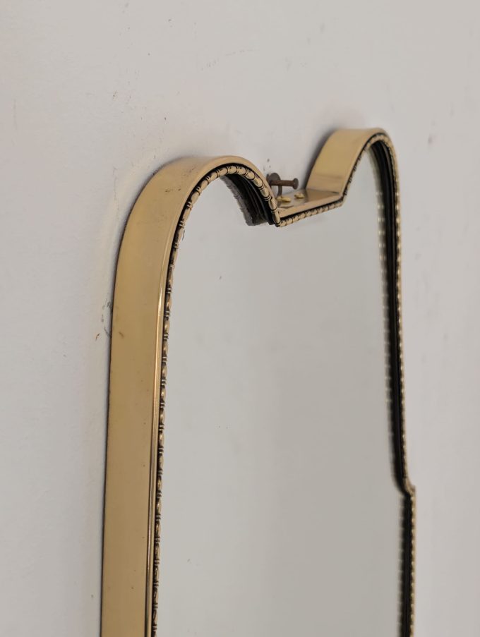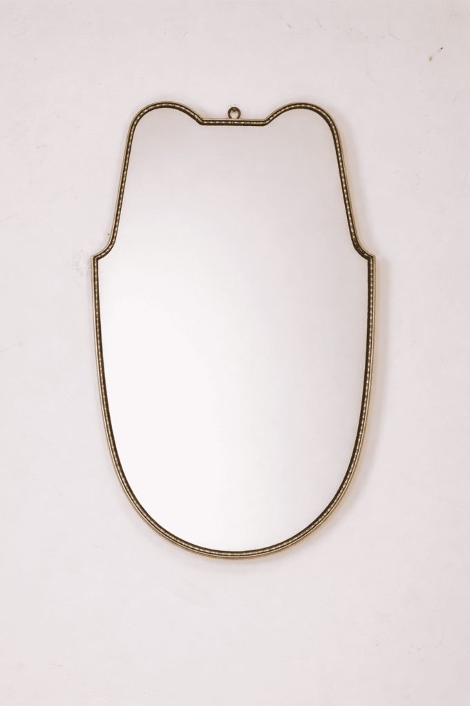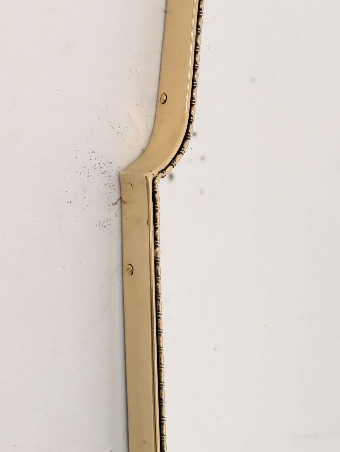 Refined brass mirror from the 1960s, an expression of Italian Mid-Century Modern taste, characterised by an elegant shield shape and a sober, architectural line reminiscent of the style of Gio Ponti.