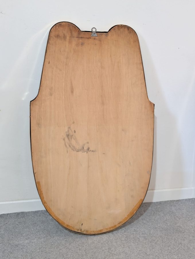 A 1960s brass mirror in Midcentury Modern style, featuring a refined shield shape and a design inspired by the style of Gio Ponti. The thin frame and elegant profile make it ideal for sophisticated spaces. The brass has been professionally polished to preserve its shine over time.