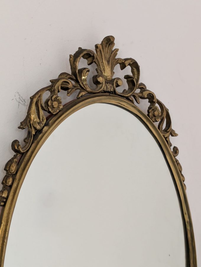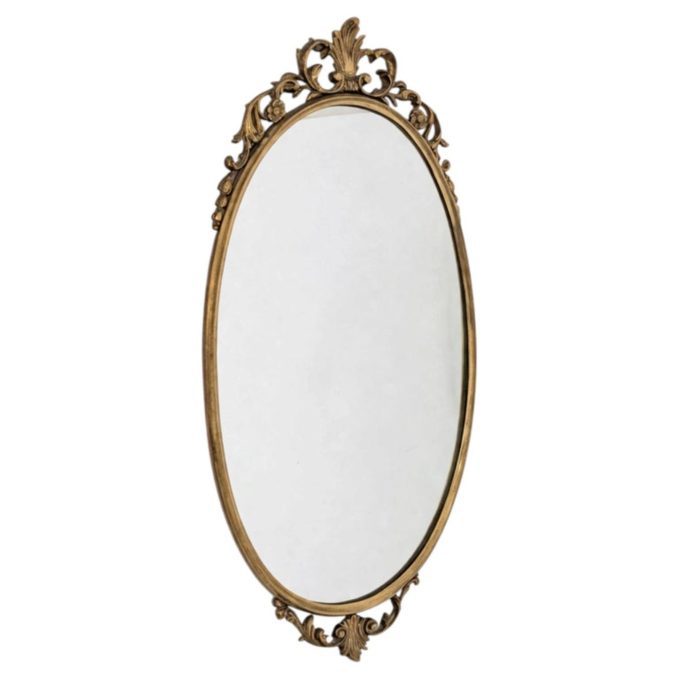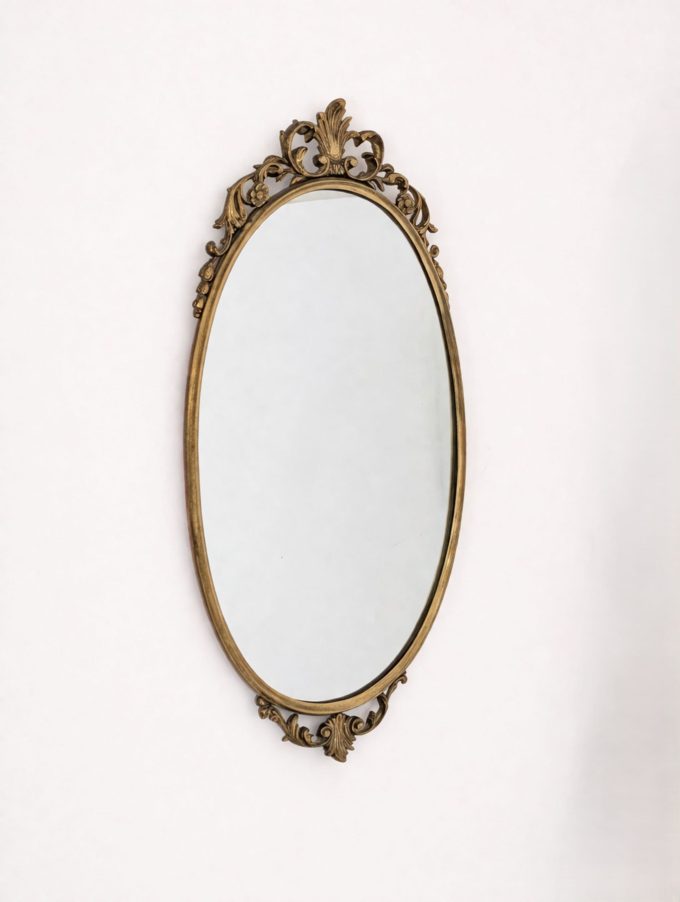 The cast bronze frame features a slender oval silhouette, enriched with wavy decorative motifs, scrolls, and ornamental details at the top and bottom. These elements recall 18th-century French decorative vocabulary, while the overall design maintains a visual composure and formal cleanliness that make it particularly appealing even in modern and sophisticated contexts.