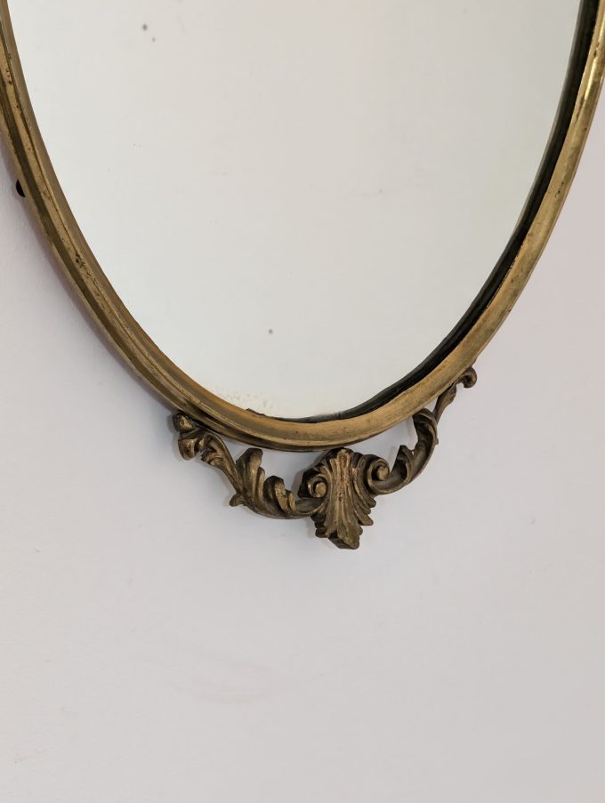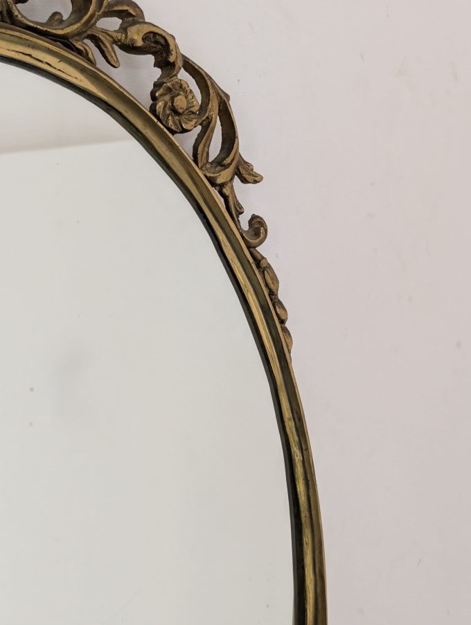 A refined Italian oval mirror from the 1950s, crafted from cast bronze and conceived as a unique piece. The piece combines the ornamental charm of Louis XV Baroque style with a formal presence that perfectly complements Midcentury Modern taste, resulting in a balanced, elegant, and striking decorative effect.