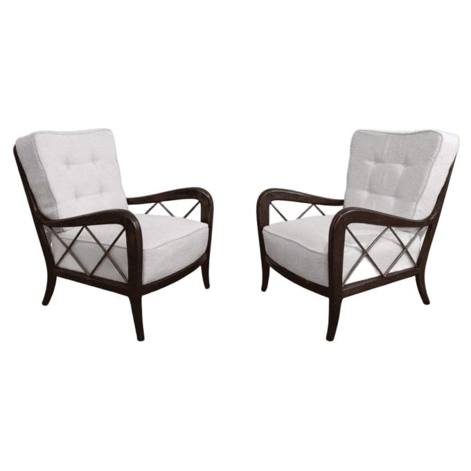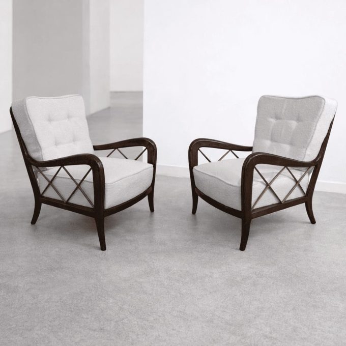 Pair of 1940s Paolo Buffa-style armchairs restored with white bouclé
