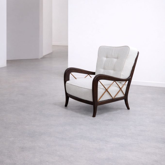 The armchairs have been meticulously restored with shellac polishing, a traditional process that enhances the wood’s surface and brings out its depth and brilliance. They have also been fully reupholstered with a high-quality white bouclé fabric, chosen to convey a fresh, textured feel and a contemporary presence while fully respecting the piece’s vintage character.