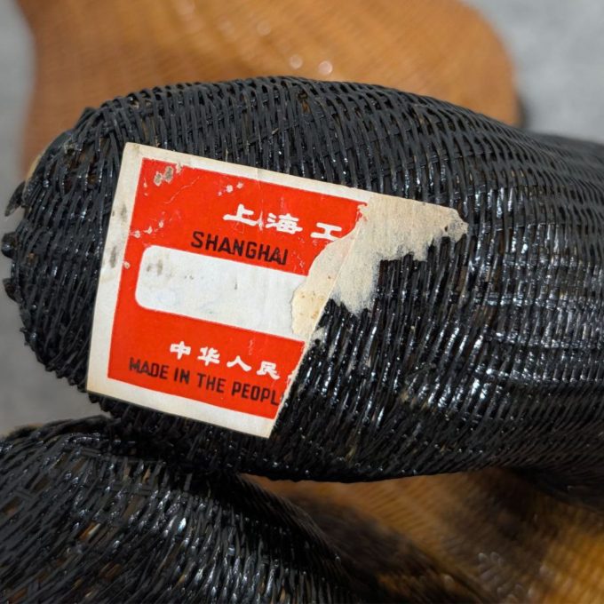The natural texture of the fiber/wicker creates a warm, organic surface, beautifully contrasting with the black painted details that define the muzzle, ears, and paws. An important plus for collectors: the original production label is included, confirming its authenticity and provenance.