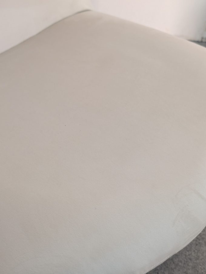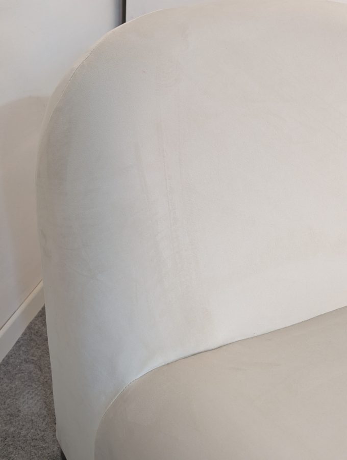 La coppia è stata rifoderata in velluto di alta qualità certificato nel colore burro, una scelta che valorizza la morbidezza delle linee e dona alle poltrone un aspetto luminoso, raffinato e contemporaneo. La tonalità neutra le rende facilmente inseribili in living eleganti, zone conversazione, camere, boutique o ambienti hospitality di gusto ricercato.