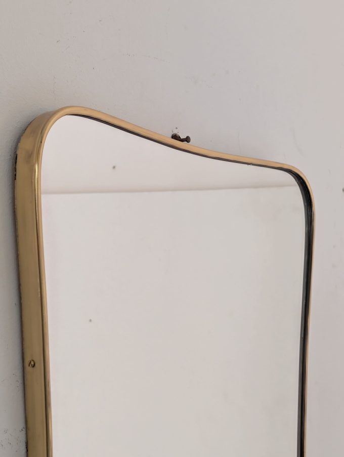Iconico specchio italiano degli anni ’50 in ottone, disegnato da Gio Ponti e caratterizzato da una raffinata forma a scudo di gusto Mid-Century Modern. La cornice sottile e il profilo morbido ed essenziale ne sottolineano l’eleganza architettonica. L’ottone è stato lucidato professionalmente per preservarne la lucentezza nel tempo.