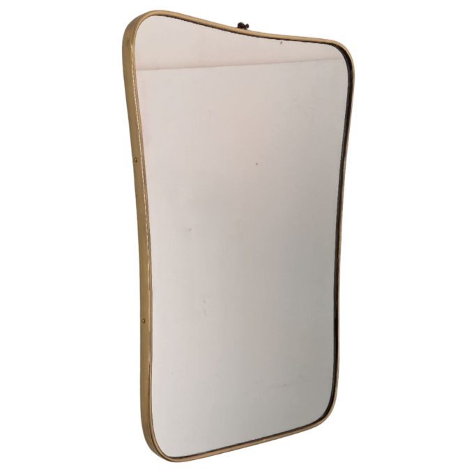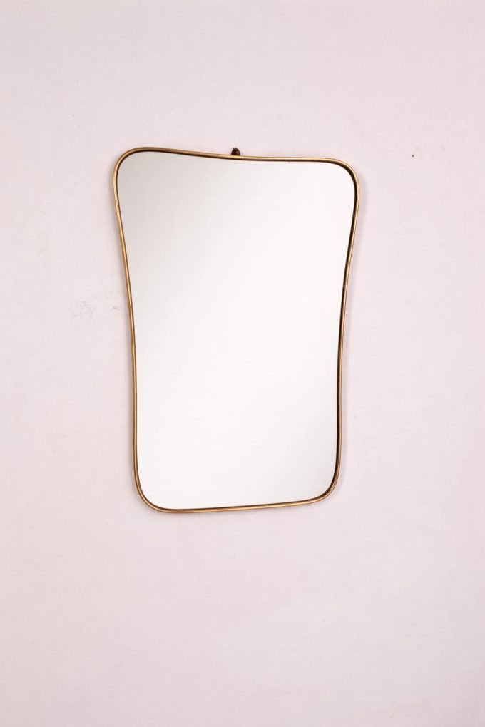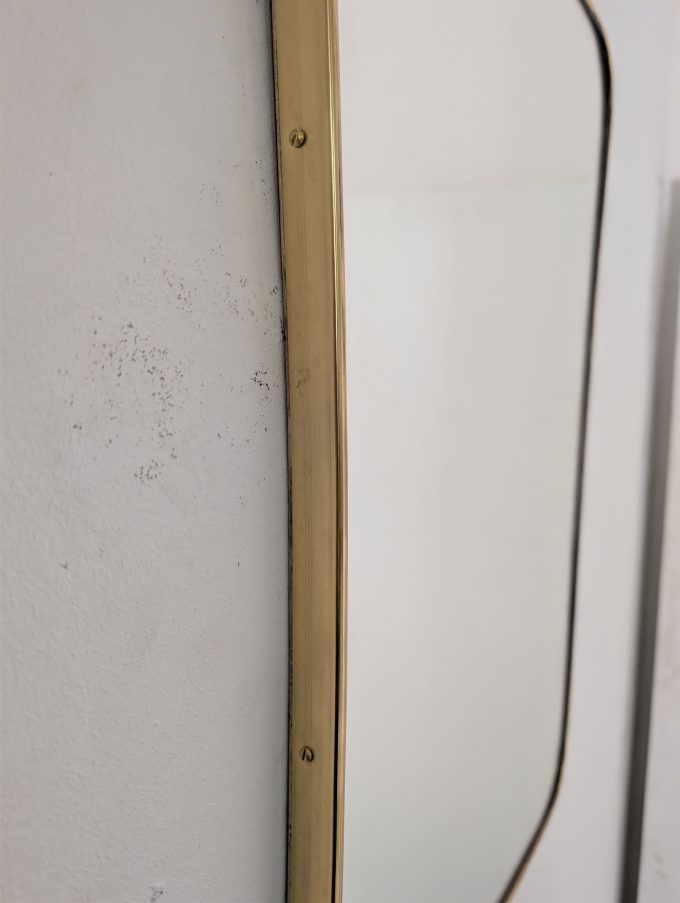 La silhouette è definita da una sottile cornice in ottone che accompagna con continuità il perimetro dello specchio, esaltandone il segno pulito e la presenza grafica. Il profilo, leggermente sagomato nella parte superiore e morbido nella curva inferiore, conferisce all’insieme una qualità architettonica e allo stesso tempo estremamente raffinata, tipica delle creazioni di Gio Ponti.