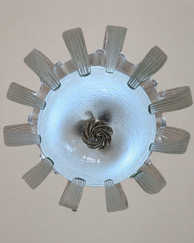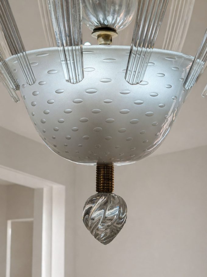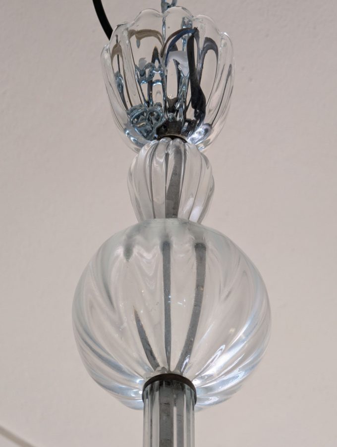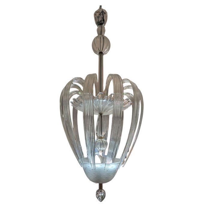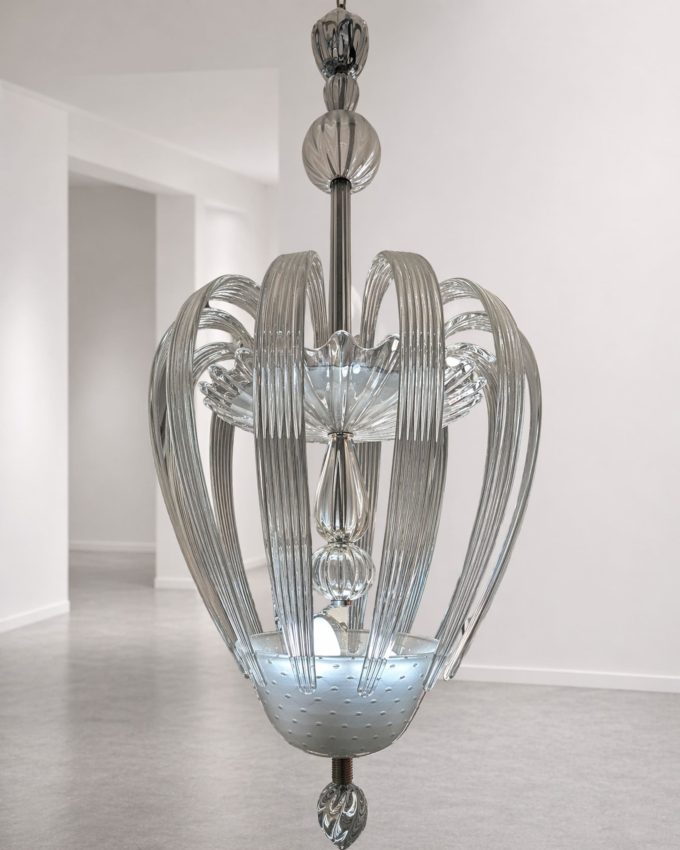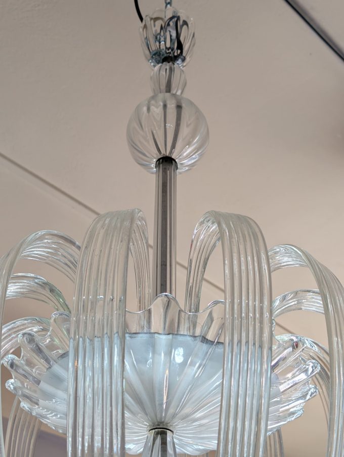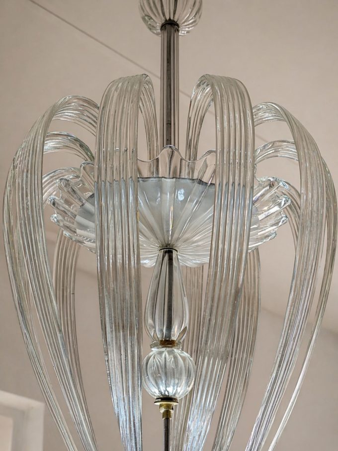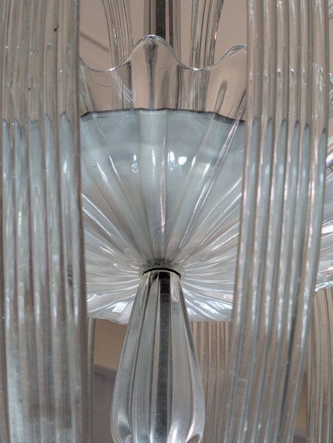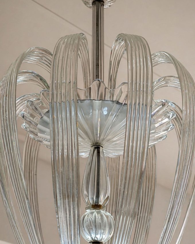 L’elemento più distintivo è la corona di lunghe foglie in vetro rigato, arcuate e disposte radialmente, che dona al pezzo una presenza leggera, scenografica e quasi floreale. Un lampadario di grande fascino, capace di unire eleganza veneziana, equilibrio decorativo e forte impatto visivo.