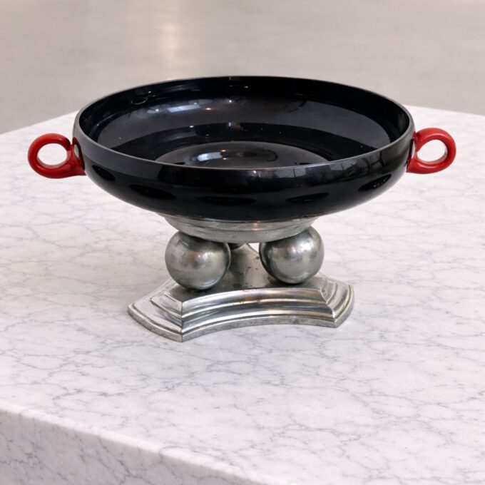 La coppa centrale è completata da un’elegante alzatina in ottone nichelato, elemento di forte impronta architettonica che richiama pienamente il linguaggio Art Déco. Il contrasto tra il vetro lucido e il metallo conferisce al pezzo una presenza scultorea e raffinata, tipica delle opere di Martinuzzi per Venini.