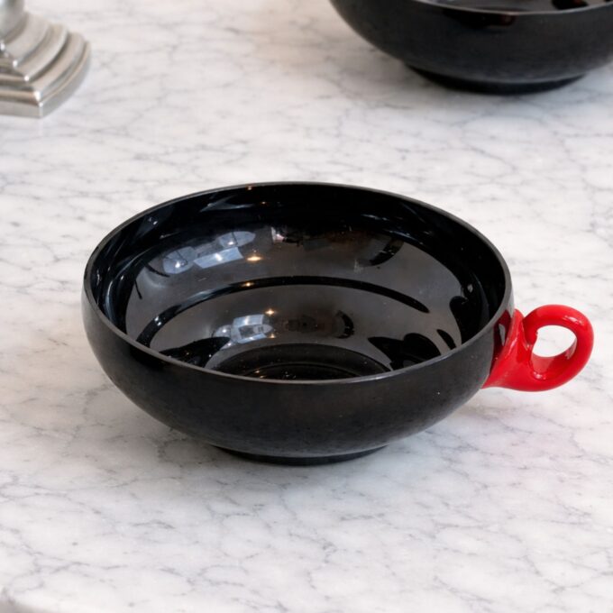 Questo set da macedonia Art Déco per sei persone è stato disegnato da Napoleone Martinuzzi e prodotto da Venini negli anni Trenta. Il servizio è composto da una coppa centrale da portata e sei coppette individuali, realizzate in vetro nero con manici applicati in vetro rosso.