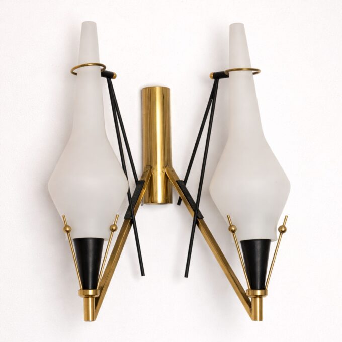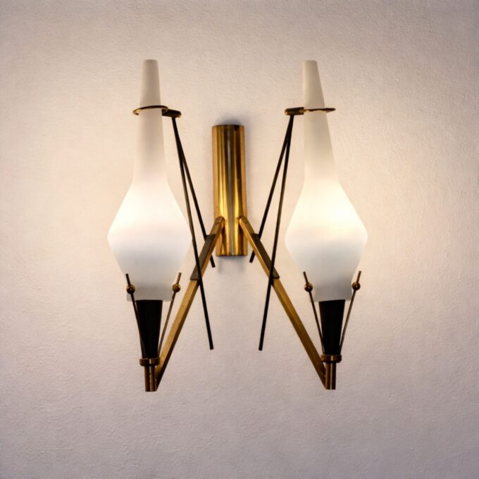 Il vetro opalino garantisce una diffusione della luce morbida e uniforme, mentre l’ottone aggiunge un accento caldo e raffinato. Il linguaggio formale richiama pienamente l’estetica Mid-Century italiana, dove funzionalità e cura dei materiali si fondono in soluzioni luminose dal carattere senza tempo.