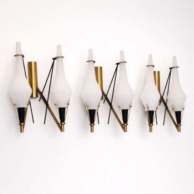 Questo set di tre applique da parete è stato realizzato in Italia negli anni Sessanta ed è caratterizzato da un design tipico del periodo, chiaramente ispirato allo stile Stilnovo. Ogni applique presenta una struttura in ottone che sostiene due diffusori in vetro opalino, creando una composizione equilibrata ed elegante.
