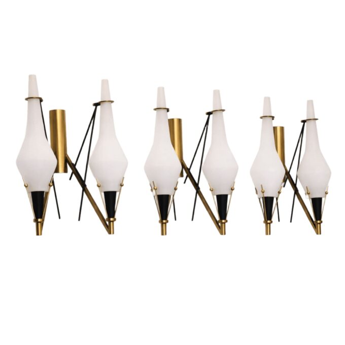 Set di tre applique in vetro opalino e ottone nello stile di Stilnovo, anni 60