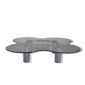 La base sottostante è caratterizzata da mensoline sfalsate come altezza, creando un effetto visivo dinamico e originale. Questo design unico aggiunge profondità e stile al tavolino, facendolo risaltare come elemento decorativo.