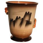 Il vaso è caratterizzato da una audace decorazione a spirale dipinta a mano, con motivi geometrici dinamici nei toni dell’arancione, grigio, bianco, marrone e nero, che riflettono la sperimentazione artistica dell’epoca. L’armoniosa combinazione di colori e forme fluide crea un effetto di movimento ed energia, tipico dell’estetica d’avanguardia degli anni ’30.